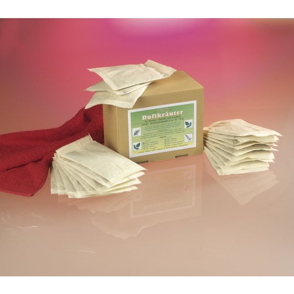 Duftkräuter, Karton mit 20 Spezial-Filterbeuteln à ca. 10-15 g/Beutel gefüllt mit getrocknetem und natürlichem Pflanzenmaterial, reine Kräuterwirkstoffe in lebensmittelgeprüfter Qualität zur Inhalation in Vital-, Kräuter- u. Dampfbädern, Maße: BxHxT 187x120x150 mm, Gew. 400 g